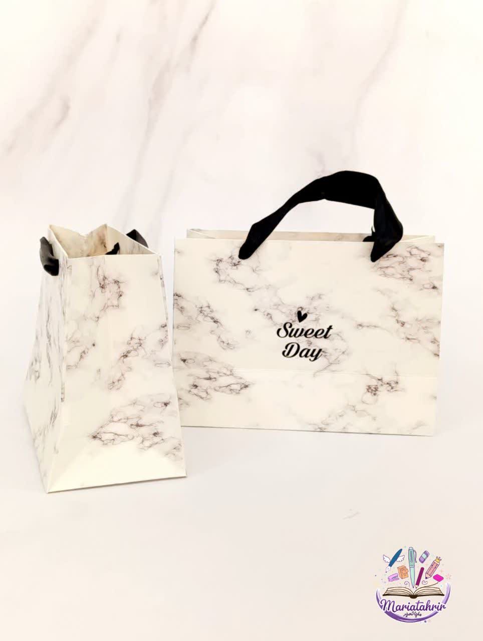 ساک کادو سفید و مشکی طرح ابر و بادی ابعاد: ۱۹×۱۴×۸
